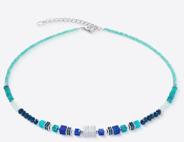 Die Halskette Wave Precious Flow silber-teal interpretiert die Trendfarbe 2026 „Transformative Teal“ in einer klaren, modernen Edelstein-Komposition. Glatte Cubes aus Lapislazuli und Türkis sorgen für ruhige Farbtiefe und eine starke visuelle Präsenz. Facettierte, gefärbte Jade-Elemente sowie Swarovski® Kristalle setzen gezielte Lichtakzente und verleihen dem Design lebendige Spannung.